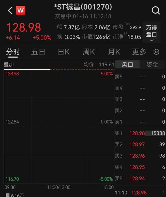 炒股就看金麒麟分析师研报,权威,专业,及时,全面,助您挖掘潜力主题机会! 1月16日,*ST铖昌开盘跌停,随后直线拉升,快速涨停,上演"地天板",截至发稿,报128.98元,成交 额超7亿元。 | < W | | *ST铖昌(001270) | | | | | --- | --- | --- | --- | --- | --- | | | | 交易中 01-16 11:12:18 | | | | | 128.98 | | 额 7.37亿 股本 2.06亿 市盈 292.9 | | | 万得 | | +6.14 | +5.00% | 换 3.03% 市值1265亿 市净 18.05 | | | 盘口 | | 分时 | 五日 | 日K | 周K 月K | | 申念 ◎ | | 叠加 | | | 均价:119.61 | 盘口 | 资金 | | 128.98 | | | 5.00% 卖5 | | 0 | | | | | | 24 | 0 | | 122.84 | | | 323 | | 0 | | | | | 322 | | 0 | | | | | 0.00% 卖1 | | 0 | | | | | 北海 | 128. ...