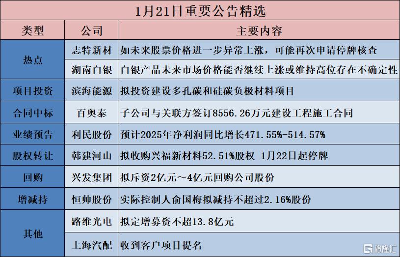 湖南白银(002716.SZ):公司白银产品未来市场价格能否继续上涨或维持高位存在不确定性 志特新材(300986.SZ):如未来公司股票价格进一步异常上涨,可能再次申请停牌核查 【项目投资】 滨海能源(000695.SZ):拟投资建设多孔碳和硅碳负极材料项目 【中标合同】 | | | 1月21日重要公告精选 | | --- | --- | --- | | 类型 | 公司 | 主要内容 | | 热点 | 志特新材 | 如未来股票价格进一步异常上涨,可能再次申请停牌核查 | | | 湖南白银 | 白银产品未来市场价格能否继续上涨或维持高位存在不确定性 | | 项目投资 | 滨海能源 | 拟投资建设多扎碳和硅碳负极材料项目 | | 合同中标 | 百奥泰 | 子公司与关联方签订8556.26万元建设工程施工合同 | | 业绩预告 | 利民股份 | 预计2025年净利润同比增长471.55%-514.57% | | 股权转让 | 韩建河山 | 拟收购兴福新材料52.51%股权 1月22日起停牌 | | 回购 | 兴发集团 | 拟斥资2亿元~4亿元回购公司股份 | | 增减持 | 恒帅股份 | 实际控制人俞国梅拟减持不 ...