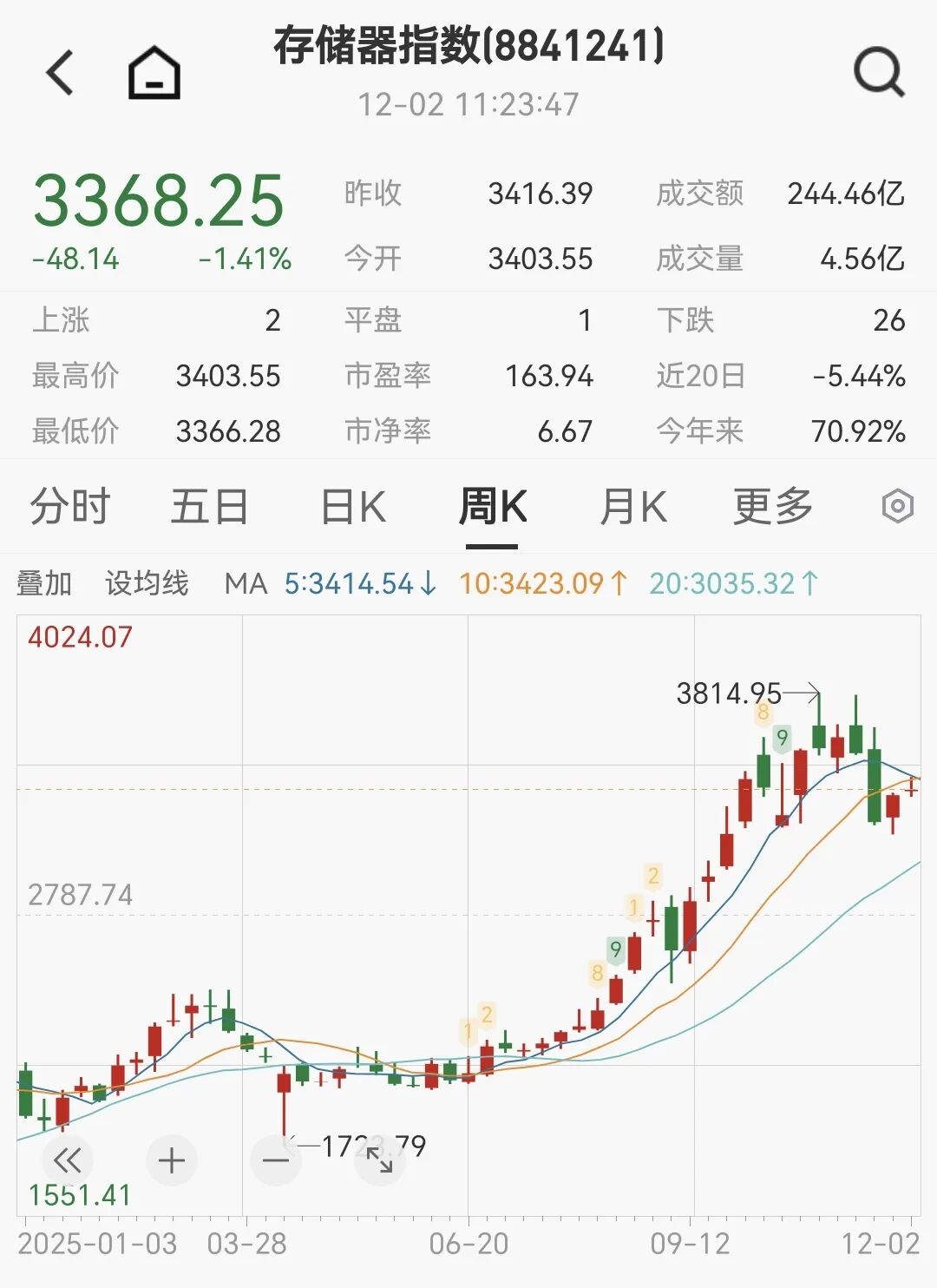 不过,据南方财经记者观察,在经历"寒潮"之后,该板块已呈现回暖趋势。 记者丨 朱治宣 孙静芳 实习生钟宸 存储器市场在11月中下旬突遇"寒潮",作为AI浪潮下的受益板块之一,存储器概念此前的上涨态势随着AI泡沫论等担忧受到剧烈影响,11月底 的板块骤降反映出市场的敏感性。 | 3368.25 昨收 3416.39 成交额 244.46亿 -48.14 -1.41% | 今开 | | | --- | --- | --- | | 上涨 == 2 | 平盘 1 - 下跌 = 26 | | | 最高价 3403.55 | 市盈率 | | | 3366.28 | | 最低价 | | 分时 五日 日K 周K 月K 更多 ◎ | | | | 叠加 设均线 MA 5:3414.54↓ 10:3423.09↑ 20:3035.32↑ | | | | 4024.07 | | | | 3814.95 > 1 | | | 截至12月1日,万得存储器指数(8841241.WI)收盘报3416.39点,当日涨幅达1.99%,已连续四个交易日上涨。存储器板块年初至今涨幅达到 97.7%(流通市值加权平均),东芯股份(688110.SH)、 ...