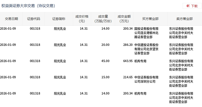 | 交易日期 | 证券代码 | 证券简称 | 成交价格 | 成交量 | 成交舍额 | 买方营业部 | 卖方营业部 | | --- | --- | --- | --- | --- | --- | --- | --- | | | | | (元) | (万股/万份) | (万元) | | | | 2026-01-09 | 001318 | 阳光乳业 | 14.31 | 14.00 | | 200.34 国投证券股份有限 | 东兴证券股份有限 | | | | | | | | 公司连云港郁州北 | 公司北京中关村大 | | | | | | | | 路证券营业部 | 街证券营业部 | | 2026-01-09 | 001318 | 阳光乳业 | 14.31 | 20.00 | | 286.20 中信建投证券股份 | 东兴证券股份有限 | | | | | | | | 有限公司北京里京 | 公司北京中关村大 | | | | | | | | 证券营业部 | 街证券营业部 | | 2026-01-09 | 001318 | 阳光乳业 | 14.31 | 45.00 | | 643.95 机构专用 | 东兴证券股份有限 | | | ...