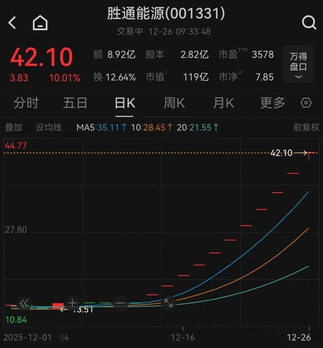 12月26日盘初,胜通能源再度涨停,报42.1元/股,走出11连板行情,最新总市值逼近120亿元。 23日晚间, 胜通能源在公告中表示, 公司不涉及机器人相关业务,公司主营业务仍为液化天然气采 购、运输及销售,未发生重大变化,收购方不存在未来十二个月内的资产重组计划。 24日晚间,胜通能源表示,如未来股票价格进一步上涨,可能向深圳证券交易所申请停牌核查。 编辑|钉钉 消息面上, 胜通能源12月11日晚间公告, 重庆特种机器人企业七腾机器人有限公司拟通过"协议受让 +部分要约收购"方式,合计斥资超16亿元持有胜通能源最多44.99%股份,成为控股股东。 自12日复牌后, 胜通能源连续涨停。值得注意的是,胜通能源已多次发布公告提示交易风险。 ...