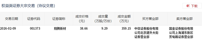 | 交易日期 | 证券代码 | 证券简称 | 成交价格 | 成交量 | 成交金额 买方营业部 (万元) | | 卖方营业部 | | --- | --- | --- | --- | --- | --- | --- | --- | | | | | (元) | (万股/万份) | | | | | 2026-02-09 | 001373 | 翔腾新材 | 38.66 | 9.29 | 359.15 中信证券股份有限 | | 国金证券股份有限 | | | | | | | | 公司北京建外大街 | 公司上海浦东新区 | | | | | | | | 证券营业部 | 芳甸路证券营业部 | 2月9日,翔腾新材大宗交易成交9.29万股,成交额359.15万元,占当日总成交额的6.58%,成交价38.66 元,较市场收盘价43.76元折价11.65%。 ...