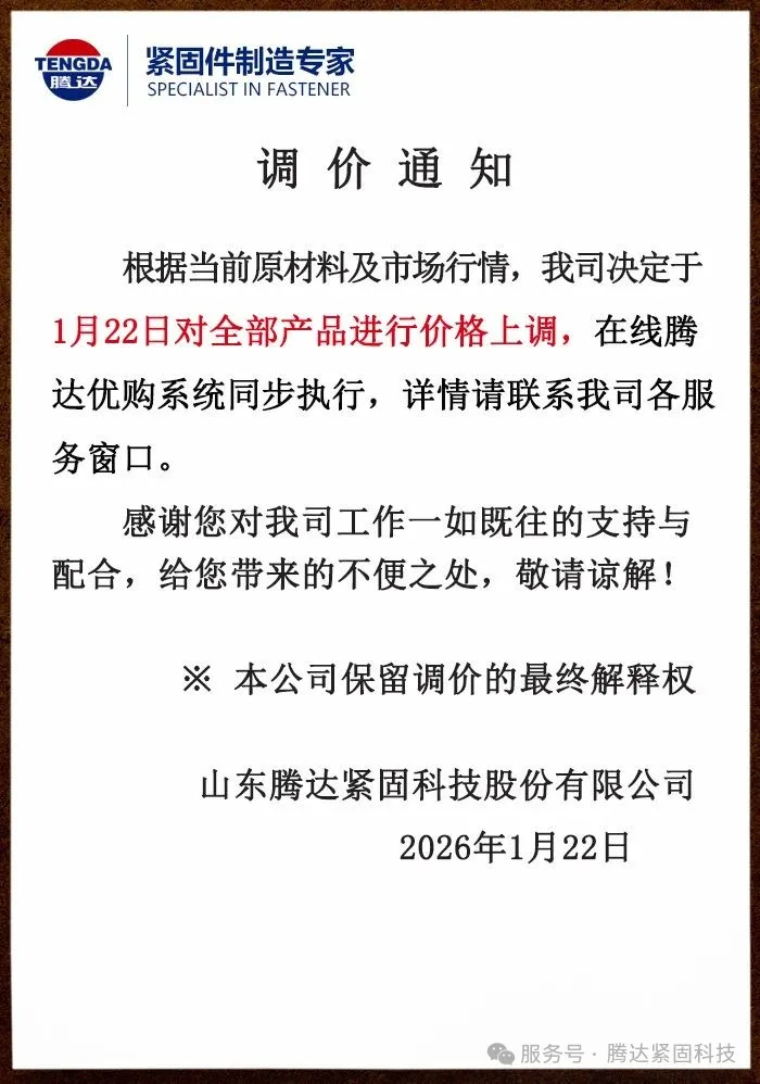 1月22日,腾达科技发布调价通知称,根据当前原材料及市场行情,公司决定于1月22日对全部产品进行 价格上调,在线腾达优购系统同步执行。据了解,这是该公司本月第三次调价、也是第二次全部产品涨 价。 调 价 通 知 山东腾达紧固科技股份有限公司 2026年1月22日 根据当前原材料及市场行情,我司决定于 1月22日对全部产品进行价格上调,在线腾 达优购系统同步执行,详情请联系我司各服 务窗口。 - 服务号 · 腾达紧固科技 感谢您对我司工作一如既往的支持与 配合,给您带来的不便之处,敬请谅解! 紧固件制造专家 SPECIALIST IN FASTENER ※ 本公司保留调价的最终解释权 ...