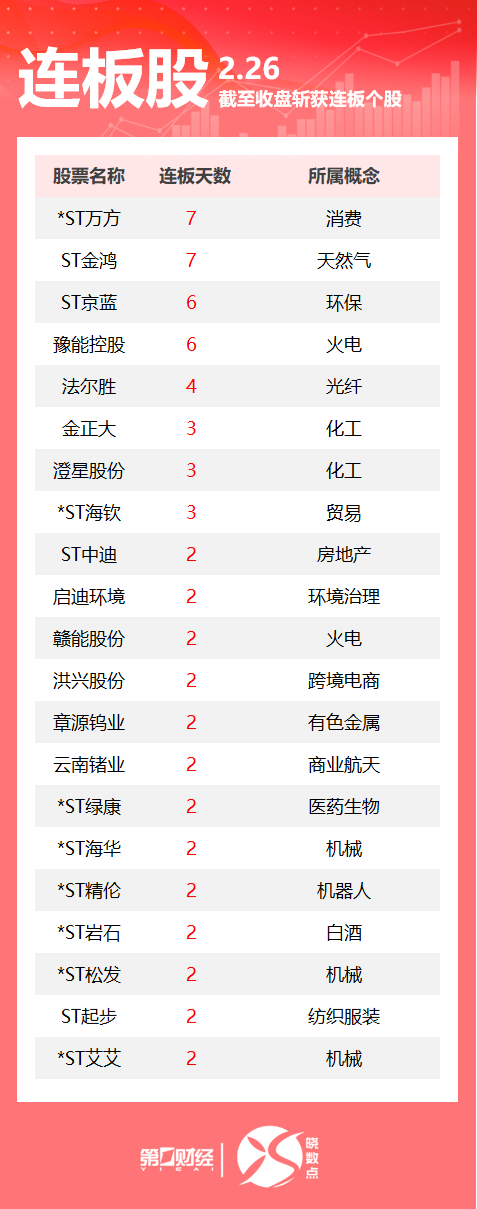 | EE 疯皮 | 2.26 | | | --- | --- | --- | | | | 截至收盘斩获连板个股 | | 股票名称 | 连板天数 | 所属概念 | | *ST万方 | 7 | 消费 | | 21 ------- | 7 | 天然气 | | ST京蓝 | 6 | 环保 | | 豫能控股 | 6 | 火电 | | 法尔胜 | 4 | 光纤 | | 金正大 | 3 | 化工 | | 澄星股份 | 3 | 化工 | | *ST海钦 | 3 | 贸易 | | ST中通 | 2 | 房地产 | | 启迪环境 | 2 | 环境治理 | | 赣能股份 | 2 | 火电 | | 洪兴股份 | 2 | 跨境电商 | | 章源钨业 | 2 | 有色金属 | | 云南省业 | 2 | 商业航天 | | *ST绿康 | 2 | 医药生物 | | *CL建花 | 2 | 机械 | | *ST精伦 | 2 | 机器人 | | *ST岩石 | 2 | 白酒 | | *ST松发 | 2 | 机械 | | --- | --- | --- | | ST起光 | 2 | 纺织服装 | | *ST艾艾 | 2 | 机械 | | | 第二 ...