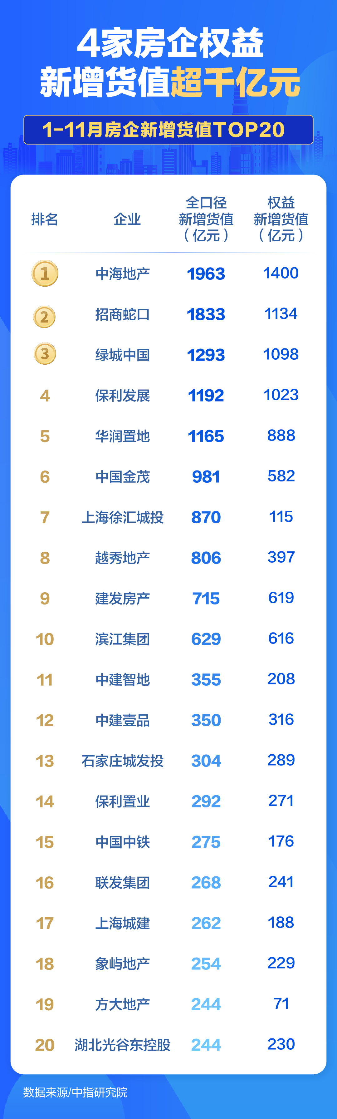 中指研究院发布的最新数据显示,2025年前11个月,权益拿地金额TOP100房企拿地总额为8478亿元, 同比增长14.1%,延续增长态势。 11月单月,民营房企拿地较为活跃,通过联合国企拿地,聚焦优势区域独立拿地,当月在热点一二线核 心城市建立了相应的优势。例如,金沙鹭岛房地产开发有限责任公司在成都经过35轮竞价以3.37亿元竞 得成都郫都区一地块,溢价率39.53%。总的来看,民营房企依旧集中在自身优势区域拿地深耕。 从新增货值来看,中海地产、招商蛇口和绿城中国位列前三。2025年1月份至11月份,中海地产新增货 值规模为1963亿元,招商蛇口新增货值规模为1833亿元,两家企业均通过获取上海城市更新项目,货值 得以大幅提升。绿城中国新增货值规模为1293亿元,位列第三。TOP10房企(以新增货值计算)2025年 前11个月新增货值总额11446亿元,占TOP100房企的47.1%。 从整体表现来看,头部企业保持领先态势。其中,中海企业发展集团有限公司(以下简称"中海地产") 以870亿元拿地金额位列榜首;绿城中国控股有限公司(以下简称"绿城中国")以588亿元排名第二,招 商局蛇口工业区控股股份有限公司 ...