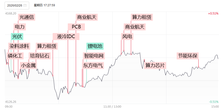 2月26日,市场探底回升,三大指数涨跌不一,创业板指盘中一度跌超1%,黄白线分化。沪深两市成交额2.54万亿,较上一个交易日放量759亿。盘面上, 市场热点快速轮动,全市场超2800只个股下跌。从板块来看,算力(核心股)硬件方向涨幅居前,PCB、CPO、液冷服务器(核心股)、算力芯片概念均表 现强势,深南电路、大族激光、广合科技、川润股份涨停。电力板块走强,赣能股份2连板,华银电力涨停。燃气轮机概念集体大涨,应流股份、万泽股 份、东方电气、常宝股份封涨停。小金属概念表现活跃,云南锗业、章源钨业双双2连板。环保股尾盘拉升,中科环保、启迪环境封涨停。下跌方面,影视 (核心股)院线、保险、房地产等板块跌幅居前。其中影视院线概念股连续大跌,博纳影业触及跌停。截至收盘,沪指跌0.01%,深成指涨0.19%,创业板 指跌0.29%。 今日全市场(不含ST股、退市股)共61股涨停,连板股总数9只,23股封板未遂,封板率为73%。焦点股方面,投资先天算力(核心股)的豫能控股6连板, 光纤概念(核心股)股法尔胜4连板,化工(核心股)板块澄星股份和金正大均晋级3连板。 一、板块异动 二、涨跌停温度 三、涨跌家数 四、涨停揭秘 | ...