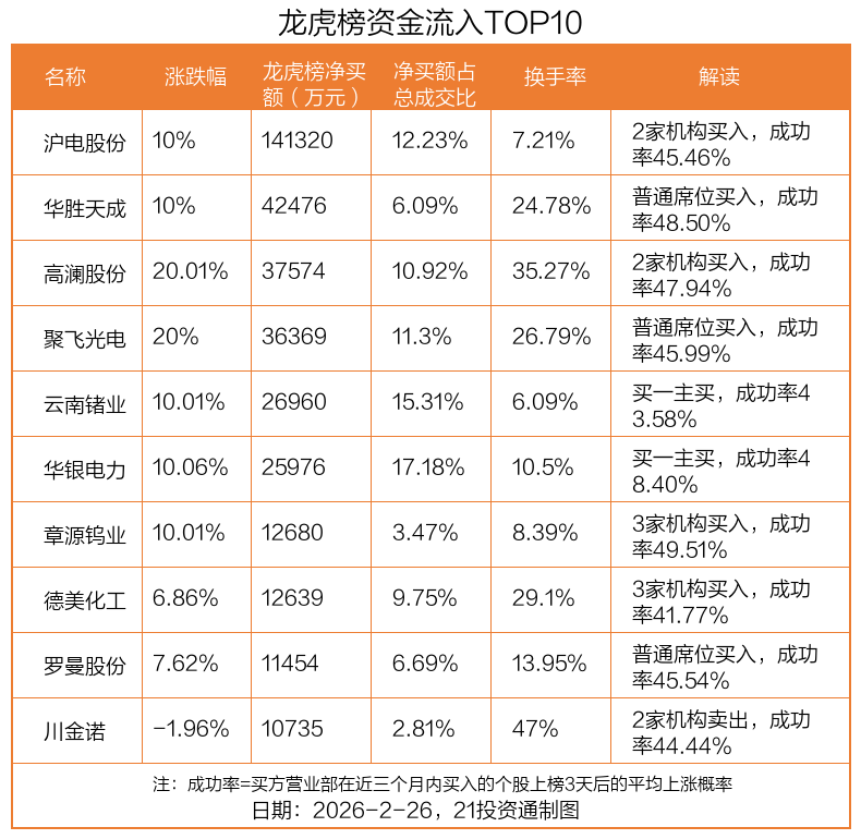 14.13亿资金抢筹沪电股份,1.94亿资金出逃电科蓝天 46只上榜的龙虎榜个股中,26只个股被净买入,20只个股被净卖出。其中,资金净买入最多的是沪电股份,达 14.13亿元,占总成交金额的12.23%。沪电股份当日收盘上涨10%,换手率为7.21%。 2月26日,上证指数下跌0.01%,深证成指上涨0.19%,创业板指下跌0.29%。盘后龙虎榜数据显示,共有46只个股 因当日异动登上龙虎榜,资金净流入最多的是沪电股份(002463.SZ),达14.13亿元。 据21投资通智能监测,30只个股龙虎榜出现了机构的身影,北向资金参与龙虎榜中的个股共涉及20只。 | 名称 | 涨跌幅 | 龙虎榜净买 | 净买额日 | 换手率 | | --- | --- | --- | --- | --- | | | | 额(万元) | 总成交比 | | | 电科蓝天 | 11.2% | -19398 | 4.84% | 46.24% | | 明阳电路 | 20% | -16059 | 5.29% | 27.62% | | 清水源 | 5.9% | -14065 | 9.09% | 44.7% | | 雅化集团 | -8.76% ...