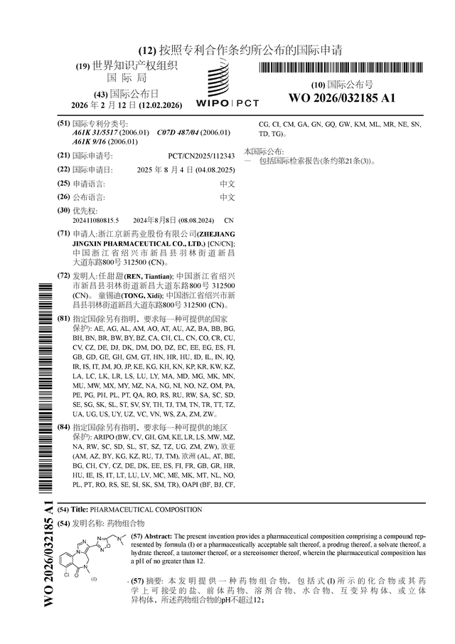 京新药业公布国际专利申请:“药物组合物”