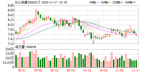 | 代码 | 名称 | 收盘价 | 涨跌幅 | 成交量(手) | 成交额(元) | | --- | --- | --- | --- | --- | --- | | 300612 | 宣亚国际 | 15.71 | -2.84% | 25.05万 | 3.93亿 | | 600986 | 浙文互联 | 9.30 | -1.48% | 70.95万 | 6.66亿 | | 600556 | 天下秀 | 7.19 | -0.42% | 262.11万 | 18.75 Z | | 603729 | 龙韵股份 | 18.06 | -0.17% | 2.00万 | 3591.32万 | | 002027 | 分众传媒 | 7.77 | -0.13% | 80.43万 | 6.25 Z | | 605168 | 三人行 | 28.08 | 0.14% | 2.75万 | 7691.55万 | | 300061 | 旗大科技 | 11.09 | 0.18% | 6.45万 | 7137.94万 | | 603825 | ST华扬 | 9.81 | 0.20% | 2.74万 | 2681.45万 | | 002995 | 天地 ...