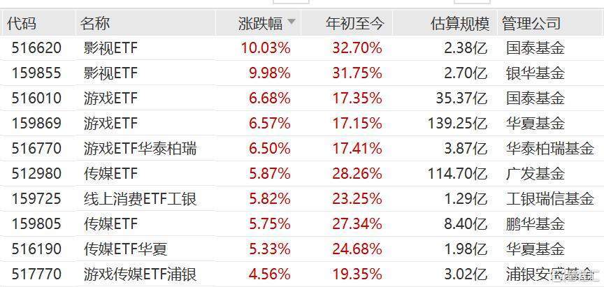 AI应用持续火热,影视ETF涨停,游戏ETF涨超6%,传媒ETF涨超5%