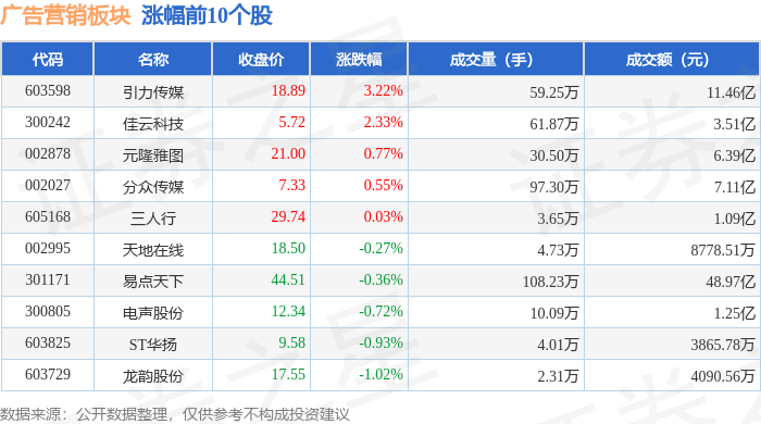 证券之星消息,11月26日广告营销板块较上一交易日下跌0.65%,宣亚国际领跌。当日上证指数报收于 3864.18,下跌0.15%。深证成指报收于12907.83,上涨1.02%。广告营销板块个股涨跌见下表: | 代码 | 名称 | 收盘价 | 涨跌幅 | 成交量(手) | 成交额(元) | | | --- | --- | --- | --- | --- | --- | --- | | 002291 | 遥望科技 | 8.44 | 10.04% | 151.93万 | | 11.92亿 | | 002264 | 新华都 | 10.79 | 9.99% | 6.86万 | | 7405.28万 | | 300061 | 旗大科技 | 11.57 | 3.77% | 28.23万 | | 3.24亿 | | 600358 | ST联合 | 5.89 | 2.43% | - 8.32万 | | 4866.50万 | | 600986 | 浙文互联 | 66'6 | 1.42% | 112.36万 | | 11.10亿 | | 301102 | 兆讯传媒 | 12.08 | 0.92% | 7.70万 | | 930 ...