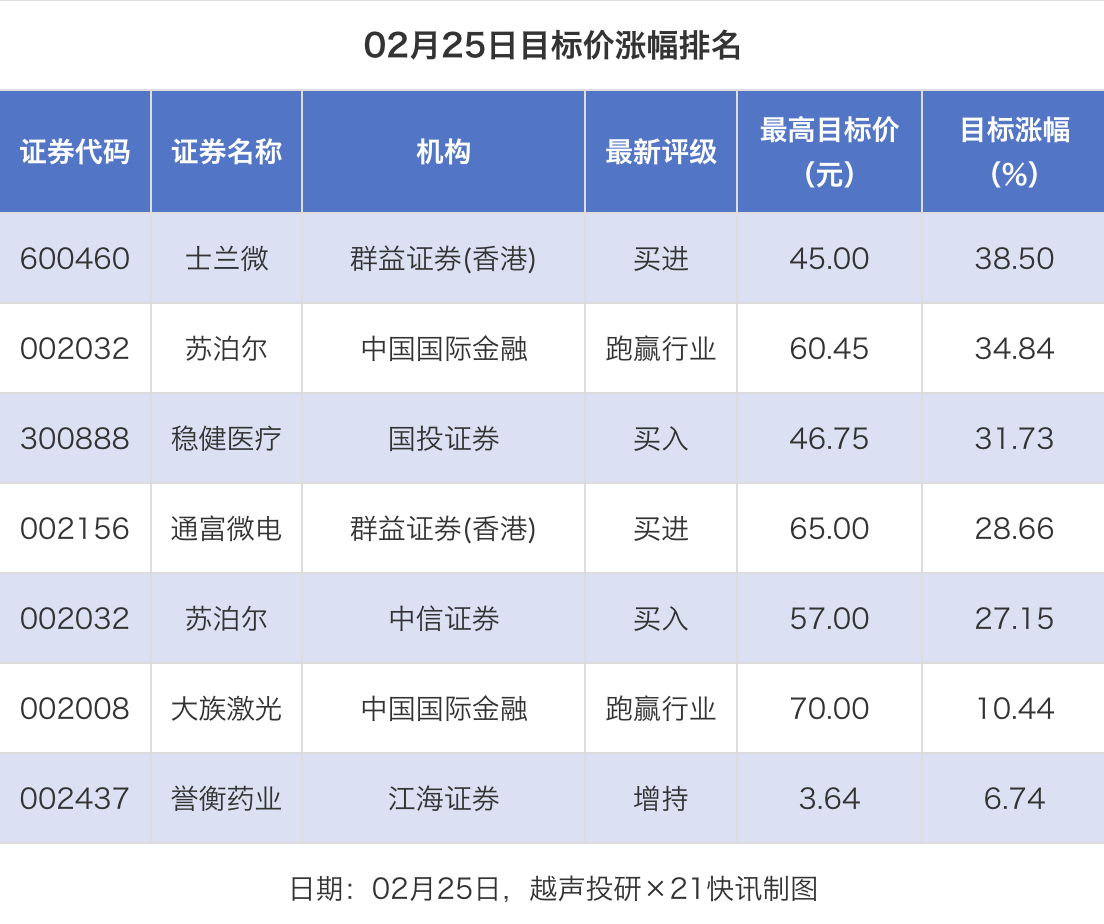 从券商推荐家数来看,2月25日有21家上市公司得到券商推荐,其中苏泊尔获得3家推荐,誉衡药业、渤海租赁等获得1家推荐。 越声投研数据显示,2月25日,券商给予上市公司目标价共7次,按最新收盘价计算,目标价涨幅排名居前的公司有士兰微、苏泊尔、稳健医疗,目标价涨幅 分别为38.50%、34.84%、31.73%,分别属于半导体、小家电、个护用品行业。 | 证券代码 | 证券名称 | 机构 | 最新评级 | 最高目标价 | 目标涨幅 | | --- | --- | --- | --- | --- | --- | | | | | | (元) | (%) | | 600460 | 士兰微 | 群益证券(香港) | 买进 | 45.00 | 38.50 | | 002032 | 苏泊尔 | 中国国际金融 | 跑赢行业 | 60.45 | 34.84 | | 300888 | 稳健医疗 | 国投证券 | 买人 | 46.75 | 31.73 | | 002156 | 通富微电 | 群益证券(香港) | 买进 | 65.00 | 28.66 | | 002032 | 苏泊尔 | 中信证券 | 买入 | 57.00 | 27. ...