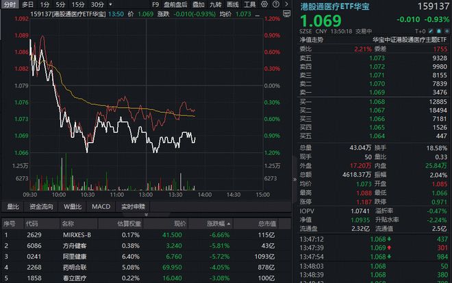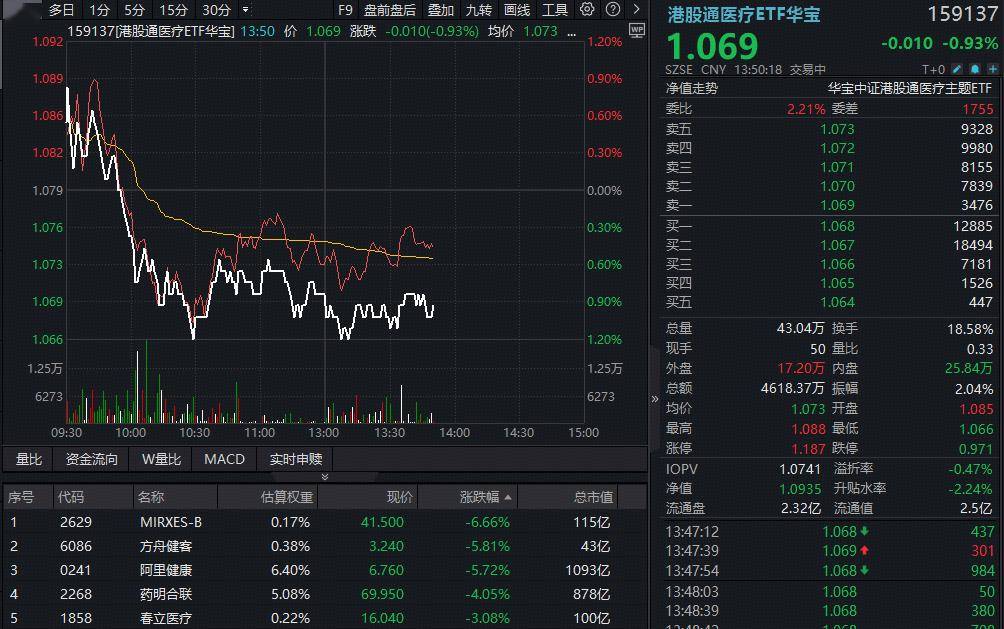 ETF盘中资讯|AI医疗继续降温,阿里健康再挫5%,港股通医疗ETF(159137)续跌1%!A股最大医疗ETF下探2%,美年健康跌停