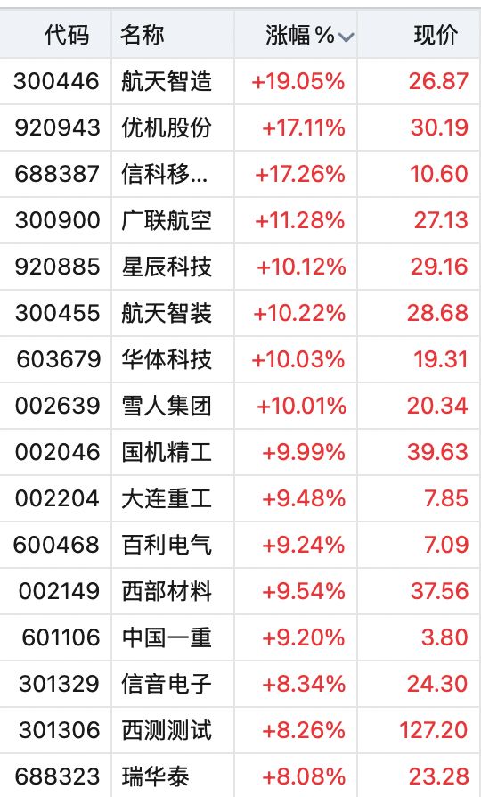 编辑 | 钉钉 | 代码 | 名称 | 涨幅 % v | 现价 | | --- | --- | --- | --- | | 300446 | 航天智造 | +19.05% | 26.87 | | 920943 | 优机股份 | +17.11% | 30.19 | | 688387 | 信科移 ... | +17.26% | 10.60 | | 300900 | 广联航空 | +11.28% | 27.13 | | 920885 | 星辰科技 | +10.12% | 29.16 | | 300455 | 航天智装 | +10.22% | 28.68 | | 603679 | 华体科技 | +10.03% | 19.31 | | 002639 | 雪人集团 | +10.01% | 20.34 | | 002046 | 国机精工 | +9.99% | 39.63 | | 002204 | 大连重工 | +9.48% | 7.85 | | 600468 | 百利电气 | +9.24% | 7.09 | | 002149 | 西部材料 | +9.54% | 37.56 | | 601106 | 中国一重 | +9.20 ...