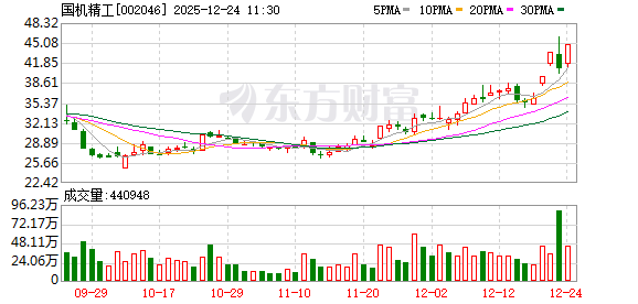 国机精工再度涨停,4个交易日内录得3个涨停,累计涨幅为24.65%,累计换手率为40.31%。截至 11:27,该股今日成交量4388.65万股,成交金额18.78亿元,换手率8.30%。最新A股总市值达240.84亿 元,A股流通市值237.48亿元。 证券时报·数据宝统计,两融数据来看,该股最新(12月23日)两融余额为10.34亿元,其中,融资余额 10.34亿元,较前一个交易日减少6938.81万元,环比下降6.29%,近4日累计减少1.96亿元,环比下降 15.95%。 据天眼查APP显示,国机精工集团股份有限公司成立于2001年12月09日,注册资本53626.6835万人民 币。(数据宝) 近日该股表现 | 日期 | 当日涨跌幅(%) | 换手率(%) | 主力资金净流入(万元) | | --- | --- | --- | --- | | 2025.12.23 | -6.33 | 16.90 | -62308.91 | | 2025.12.22 | 9.99 | 6.73 | -519.04 | | 2025.12.19 | 9.99 | 8.38 | 27765.86 | | 2025.12. ...