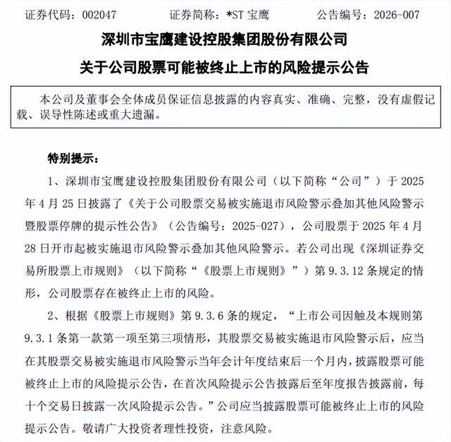 1月27日晚间,*ST宝鹰(股票代码:002047)发布重大风险提示公告,称公司股票存在被终止上市的 可能。 公开资料显示,*ST宝鹰全称为深圳市宝鹰建设控股集团股份有限公司,成立于1993年4月30日,2005 年5月31日在深交所挂牌上市,总部位于广东省深圳市福田区。公司主营业务聚焦于综合建筑装饰装修 工程的设计与施工,其中装饰装修工程收入占比达61.06%,建筑工程占29.92%,其余业务占9.02%。 2025年8月,原董事长吕海涛因个人原因辞去公司第八届董事会董事长、董事及相关职务。随后,李鹏 接任公司董事长。李鹏出生于1980年,拥有东北大学土木工程本科学历,是建筑工程管理正高级工程 师。目前,他还担任珠海大横琴股份有限公司党总支书记、董事、总经理及法定代表人,并兼任多家大 横琴体系子公司的高管职务。 面对净资产逼近警戒线的严峻形势,*ST宝鹰能否在年报审计前扭转局面,避免退市命运,市场将持续 关注。 根据公司财务部门初步测算,*ST宝鹰预计2025年度实现归属于上市公司股东的净利润为4900万元至 6300万元,但扣除非经常性损益后的净利润仍为亏损,区间在-4300万元至-2900万元之间。同期 ...