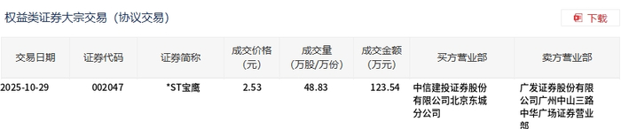 Group 1 - The core point of the news is that *ST Baoying executed a block trade on October 30, with a total of 488,300 shares traded at a price of 2.66 yuan, which is a discount of 9.22% compared to the market closing price of 2.93 yuan [1][2] - The total transaction amount for the block trade was 1.2989 million yuan, accounting for 19.57% of the total trading volume on that day [1][2] - The buyer of the shares was Guotou Securities Co., Ltd., while the seller was CITIC Construction Investment Securities Co., Ltd. [2]