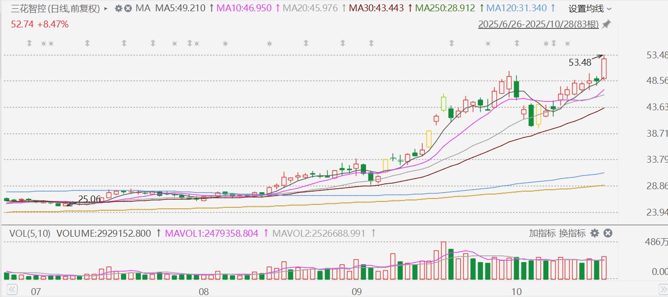 Group 1 - The core viewpoint of the article highlights the significant stock price increase of Sanhua Intelligent Control, with shares rising over 7% and reaching a new high of 51.83 yuan during trading [1] - Sanhua Intelligent Control plans to hold a board meeting on October 30 to consider and approve the unaudited third-quarter results for the nine months ending September 30, 2025 [1] - Tesla recently updated its plans during a quarterly earnings call, indicating that the Optimus V3 will be launched in Q1 2026, with a production line of one million units starting by the end of the year [1] Group 2 - Dongfang Securities noted that Sanhua Intelligent Control is accelerating the development of emerging businesses in robotics and data center liquid cooling, which opens new growth opportunities [1] - In the first half of the year, the company continued to focus on the robotics electromechanical actuator business, collaborating with clients on the research, iteration, and sampling of a full range of products, achieving client recognition and eventual mass production [1] - The firm believes that Sanhua Intelligent Control has a first-mover advantage in the robotics actuator field and is likely to capture more market share in the industrialization process of robotics [1]