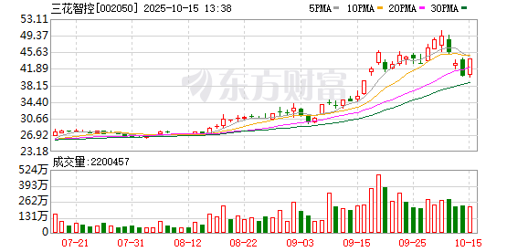 每经AI快讯,10月15日,港股三花智控(02050.HK)午后飙升逾10%,截至发稿,涨10.52%,报38.66港 元,成交额10.58亿港元。 ...