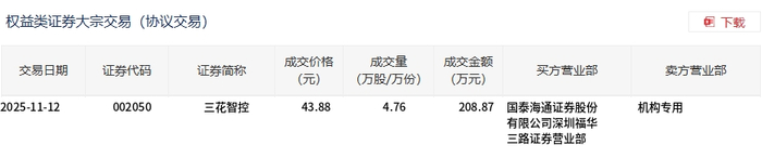 三花智控大宗交易成交208.87万元,卖方为机构专用席位