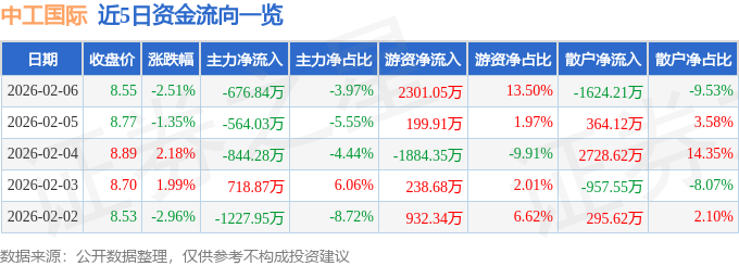 证券之星消息,截至2026年2月6日收盘,中工国际(002051)报收于8.55元,下跌2.51%,换手率1.6%, 成交量19.82万手,成交额1.7亿元。 2月6日的资金流向数据方面,主力资金净流出676.84万元,占总成交额3.97%,游资资金净流入2301.05 万元,占总成交额13.5%,散户资金净流出1624.21万元,占总成交额9.53%。 近5日资金流向一览见下表: | | | | 日期 收盘价 涨跌幅 主力净流入 主力净占比 游资净占比 散户净流入 散户净占比 | | | | | | --- | --- | --- | --- | --- | --- | --- | --- | | 2026-02-06 | 8.55 -2.51% | -676.84万 | -3.97% | 2301.05万 | 13.50% | -1624.21万 | -9.53% | | 2026-02-05 | 8.77 -1.35% | -564.03万 | -5.55% | 199.91万 | 1.97% | 364.12万 | 3.58% | | 2026-02-04 | 8.89 2.18% | -844.28 ...