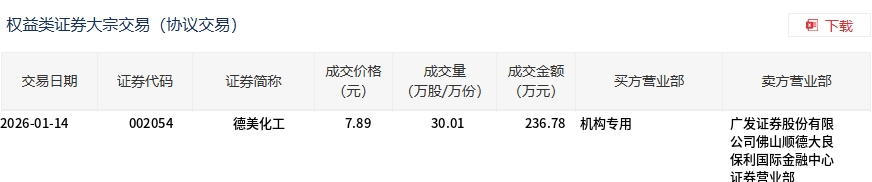 德美化工1月14日现1笔大宗交易 总成交金额236.78万元 其中机构买入236.78万元 溢价率为-10.44%