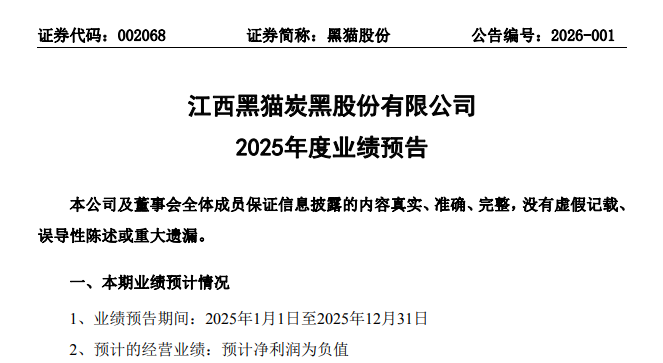 黑猫股份:预计2025年净利润亏损4.2亿元–4.7亿元