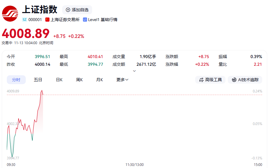 锂电池概念掀涨停潮。 11月13日,A股主要指数低开高走,沪指、深证成指等集体翻红。截至发稿,上证指数上涨0.22%,报4008.89点;深证成指上涨0.68%,创业板指上涨 0.66%,北证50指数涨超2%。 | 今开 | 3996.51 | 最高 | | 4010.41 | 成交量 | 1.90亿手 | 涨跌额 | +8.75 | 振幅 | | 0.39% | | --- | --- | --- | --- | --- | --- | --- | --- | --- | --- | --- | --- | | 昨收 | 4000.14 | 最低 | | 3994.77 | 成交额 | 2671.12亿 V | 涨跌幅 | +0.22% | 量比 | | 2.21 | | 分时 | 五日 | 日K | 團K | 月K | 更多v | | | 6 高级工具 | | で AI技术追踪 | | | 4009.89 | | | | | | | | | | | 0.24% | | | | | | | | | | | | | 0.05% | | 3994.77 | | | | | | | | | | | -0.13% ...