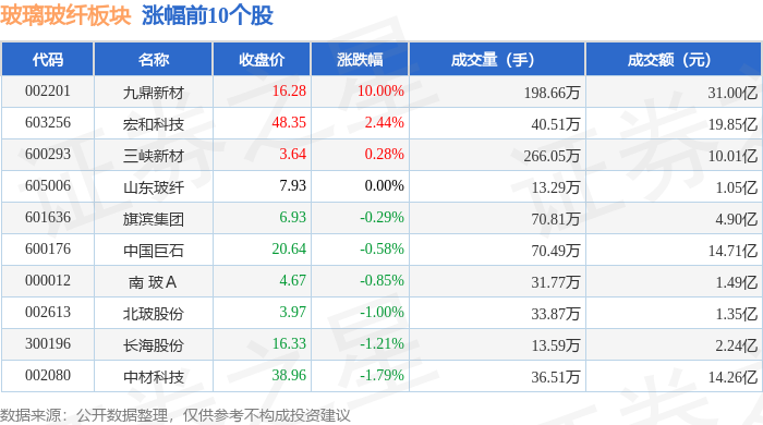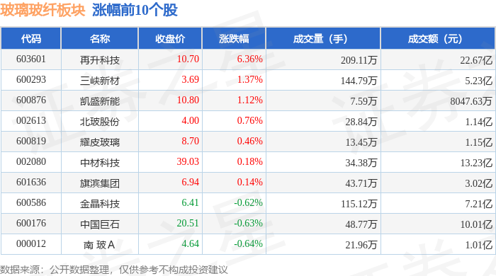 | 代码 | 名称 | 收盘价 | 涨跌幅 | 成交量(手) | 成交额(元) | | --- | --- | --- | --- | --- | --- | | 601112 | N振石 | 24.78 | 121.65% | 120.23万 | 32.20 乙 | | 301526 | 国际复材 | 8.66 | 3.96% | 332.08万 | 30.19亿 | | 600293 | 三峡新材 | 3.73 | 1.91% | 89.17万 | 3.27亿 | | 618009 | 耀皮玻璃 | 8.52 | 1.43% | 13.65万 | 1.16亿 | | 601636 | 旗滨集团 | 7.20 | 1.41% | 80.82万 | 5.83亿 | | 603601 | 再升科技 | 11.90 | 1.10% | 257.68万 | 30.28亿 | | 000012 | 南 玻 A | 4.71 | 0.86% | 24.62万 | 1.16亿 | | 002613 | 北玻股份 | 3.92 | -1.26% | 17.90万 | 7056.33万 | | 605006 | 山东玻纤 | ...