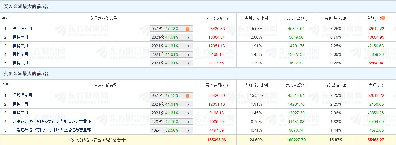 | 序号 | 交易营业部名称 | | 买入金额(万) | 占总成交比例 | | --- | --- | --- | --- | --- | | 深股通专用 | | 957次 47.13% 2 | 98426.86 | 15.58% | | 2 机构专用 | | 2021次 41.61% | 12051.13 | 1.91% | | 3 机构专用 | | 2021次 41.61% | 9168.13 | 1.45% | | 4 | 开源证券股份有限公司西安太华路证券营业部 | 128次 42.19% | 4986.99 | 0.79% | | 5 | 广发证券股份有限公司郑州农业路证券营业部 | 40次 32.50% | 4497.89 | 0.71% | | | (买入前5名与卖出前5名)总合计: | | 155393.06 | 24.60% | 格隆汇2月12日|中材科技(002080.SZ)今日涨停两连板,股价创历史新高,换手率7.73%,成交额63.17亿元。龙虎榜数据显示,深股通买入9.84亿元,卖出 4.58亿元,净买入5.26亿元;四家机构买入4.75亿元,卖出3.39亿元,净买入1.36亿元。上 ...