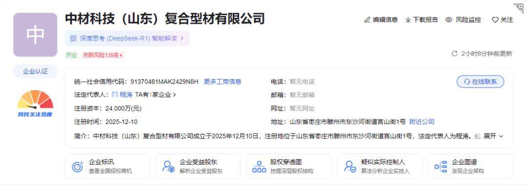 近日,中材科技(002080.SZ)全资子公司——中材科技(山东)复合型材有限公司落地滕州,注册资本2.4亿元,经营范围涉及高性能纤维及复合材料制 造、高性能纤维及复合材料销售、玻璃纤维增强塑料制品制造等。 中材科技注册地位于江苏省南京市,2001年12月成立,2006年11月上市,主营业务是玻璃纤维及制品、风电叶片、锂电池隔膜三大主导产业,同时从事高 压复合气瓶、膜材料及其他复合材料制品的研发、制造及销售,主要产品为风电叶片、玻璃纤维及其制品、锂电池隔膜等。 来源:海报新闻、爱企查 作者提示: 素材来源官方媒体/网络新闻,文中事件发生于2025年12月15日 中材科技(山东)复合型材有限公司是中材科技在山东落地的第三家子公司。之前,已在山东落地泰山玻璃纤维有限公司、中材锂膜有限公司(中材科技 为第一大股东,持股48.39%)。从产业链条看,三家山东子公司实现"原料—材料—部件"的垂直整合。 ...