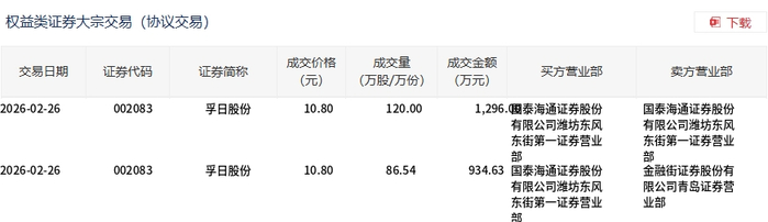 | 交易日期 | 证券代码 | 证券简称 | 成交价格 | 成交量 | 成交金额 买方营业部 | 卖方营业部 | | --- | --- | --- | --- | --- | --- | --- | | | | | (元) | (万股/万份) | (万元) | | | 2026-02-26 | 002083 | 击目龄得 | 10.80 | 120.00 | 1,296. 国泰海通证券股份 | 国泰海通证券股份 | | | | | | | 有限公司潍坊东风 | 有限公司潍坊东风 | | | | | | | 东街第一证券营业 | 东街第一证券营业 | | | | | | | สิต | 86 | | 2026-02-26 | 002083 | 委目赔偿 | 10.80 | 86.54 | 934.63 国泰海通证券股份 | 金融街证券股份有 | | | | | | | 有限公司潍坊东风 | 限公司青岛证券营 | | | | | | | 东街第一证券营业 | 业部 | | | | | | | a | | 2月26日,孚日股份大宗交易成交206.54万股,成交额2230.63万元,占当日总成交额的2.74%,成交 ...