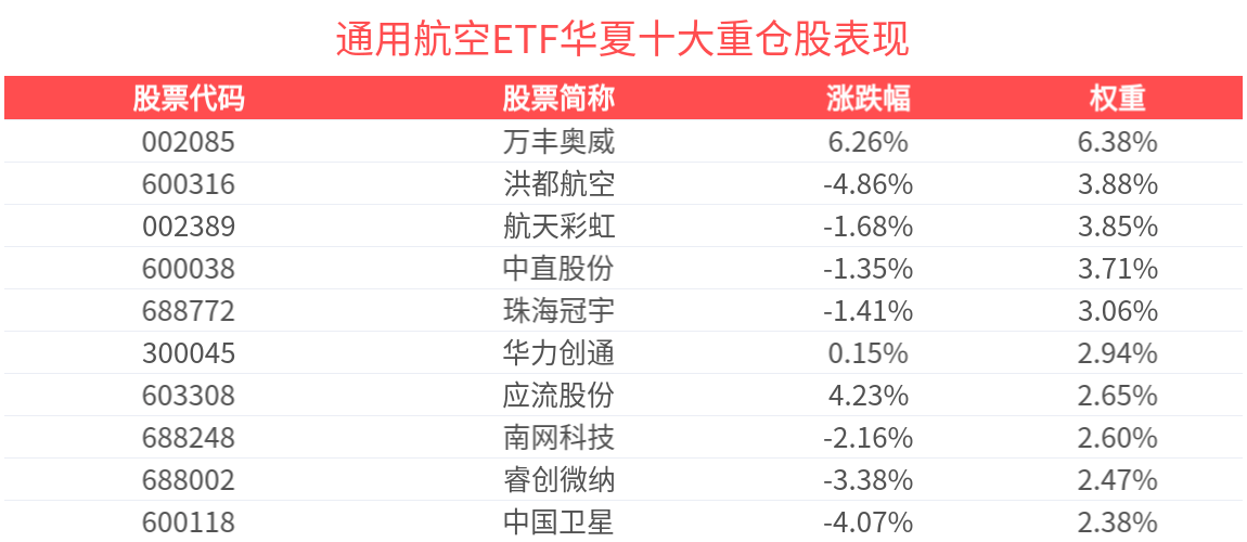 | 股票代码 | 股票简称 | 涨跌幅 | 权重 | | --- | --- | --- | --- | | 002085 | 万丰奥威 | -0.79% | 6.38% | | 600316 | 洪都航空 | -2.99% | 3.88% | | 002389 | 航天彩虹 | -1.40% | 3.85% | | 600038 | 中直股份 | -0.76% | 3.71% | | 688772 | 珠海冠宇 | -0.86% | 3.06% | | 300045 | 华力创通 | -3.68% | 2.94% | | 603308 | 应流股份 | 2.03% | 2.65% | | 688248 | 南网科技 | 1.67% | 2.60% | | 688002 | 睿创微纳 | 1.10% | 2.47% | | 600118 | 中国卫星 | -4.92% | 2.38% | (以上所列股票仅为指数成份股,无特定推荐之意) 开源证券分析指出,中国商业航天正迈入技术迭代与产业落地双轮驱动的新发展阶段,行业增长动能显著增强。 通用航空ETF基金紧密跟踪国证通用航空产业指数,截至2025年12月31日, ...