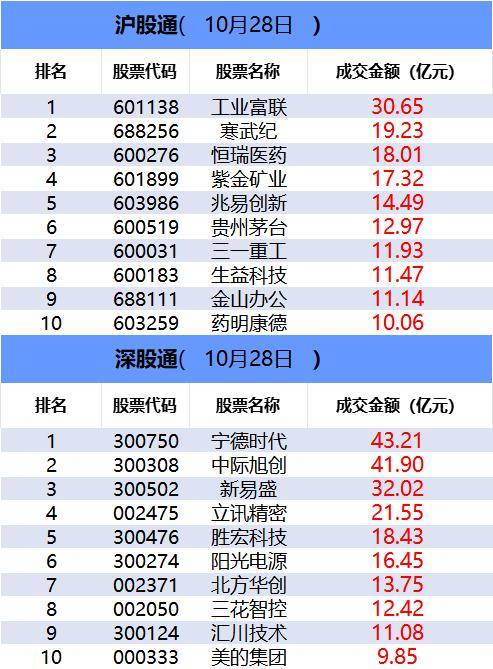沪深股通今日合计成交2371.33亿,其中工业富联和宁德时代分居沪股通和深股通个股成交额首位。板块主力资金方 面,国防军工板块主力资金净流入居首。ETF成交方面,黄金基金ETF(518800)成交额环比增长198%。期指持仓 方面,IC、IM合约空头减仓数量大于多头。龙虎榜方面,中钨高新获两家实力游资(国泰海通证券上海江苏路和华 鑫证券江苏分公司)分别买入1.03亿元和8871万元。恒宝股份获四家机构买入1.93亿,却遭深股通席位卖出1.04亿, 遭国泰海通证券上海新闸路席位卖出1.25亿,国泰海通证券上海中山东路卖出8309万。 一、沪深股通前十大成交 今日沪股通总成交金额为1170.01亿,深股通总成交金额为1201.32亿。 | | | 沖股通( 10月28日 œ | | | --- | --- | --- | --- | | 排名 | 股票代码 | 股票名称 | 成交金额(亿元) | | 1 | 601138 | 工业富联 | 30.65 | | 2 | 688256 | 寒武纪 | 19.23 | | 3 | 600276 | 日瑞失药 | 18.01 | | 4 | 668109 | 亲受处,不 ...