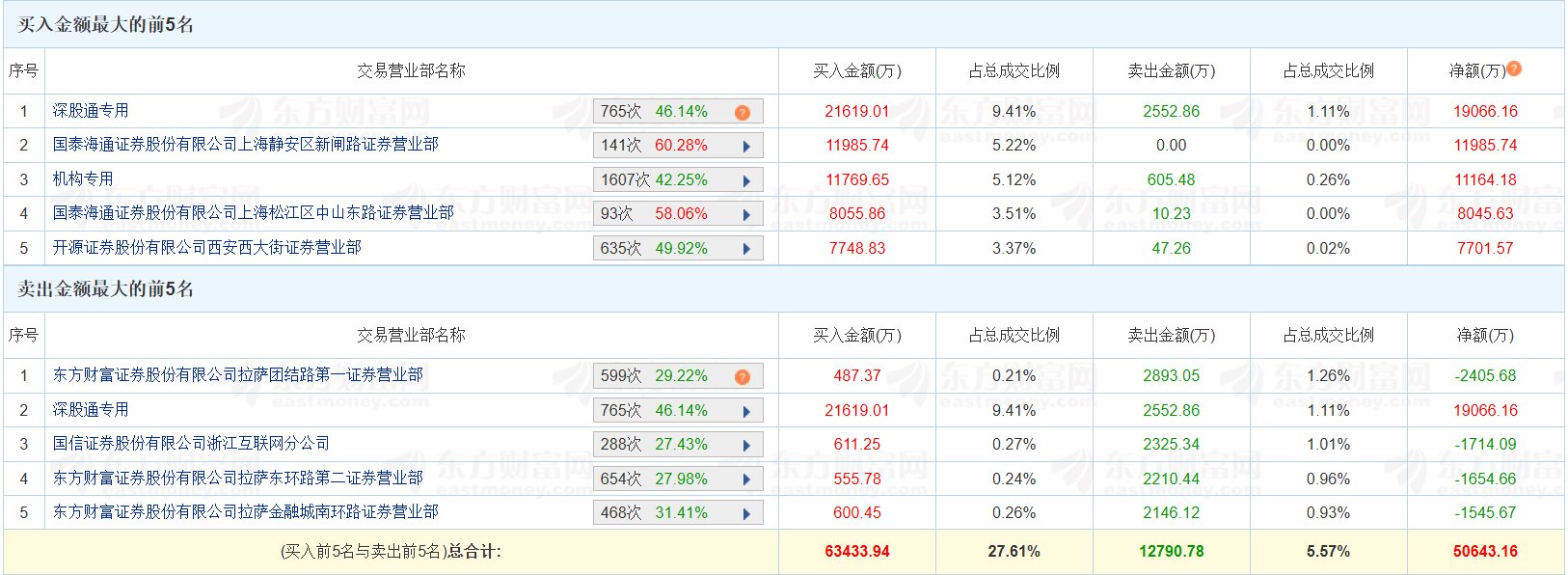 格隆汇10月27日|恒宝股份(维权)(002104.SZ)今日涨停,换手率17.5%,成交额22.98亿元。龙虎榜数据显示,深股通买入2.16亿元,卖出2553万元,净买 入1.91亿元;一机构买入1.18亿元,卖出605万元,净买入1.12亿元;游资"中山东路"位列买四席位,净买入8046万元;"量化打板"位列买五席位,净买入 7702万元。上榜席位全天买入6.34亿元,卖出1.28亿元,合计净买入5.06亿元。(格隆汇) | 序号 | 交易营业部名称 | | | 买入金额(万) | 占总成交比例 | | --- | --- | --- | --- | --- | --- | | 1 | 深股通专用 | 765次 46.14% | 2 | 21619.01 | 9.41% | | 2 | 国泰海通证券股份有限公司上海静安区新闻路证券营业部 | 141次 60.28% | ▶ | 11985.74 | 5.22% | | 3 | 机构专用 | 1607次 42.25% | A | 11769.65 | 5.12% | | 4 | 国泰海通证券股份有限公司上海松江区中山东路证券营业部 | 93次 58.06% ...