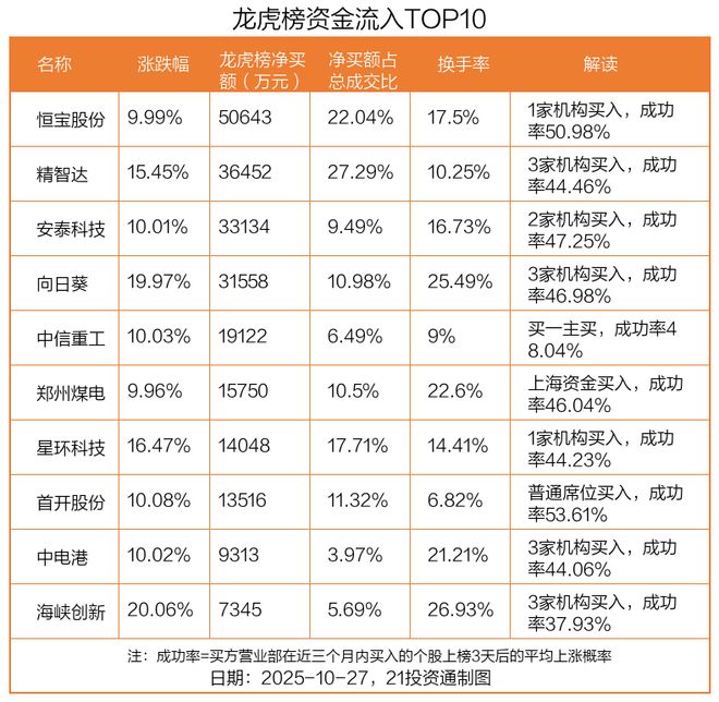 10月27日,上证指数上涨1.18%,深证成指上涨1.51%,创业板指上涨1.98%。盘后龙虎榜数据显示,共 有50只个股因当日异动登上龙虎榜,资金净流入最多的是恒宝股份(002104.SZ),达5.06亿元。 据21投资通智能监测,29只个股龙虎榜出现了机构的身影,北向资金参与龙虎榜中的个股共涉及22只。 5.06亿资金抢筹恒宝股份,4.71亿资金出逃科华数据 50只上榜的龙虎榜个股中,24只个股被净买入,26只个股被净卖出。其中,资金净买入最多的是恒宝股 份,达5.06亿元,占总成交金额的22.04%。恒宝股份当日收盘上涨9.99%,换手率为17.5%。 | 名称 | 涨跌幅 | 戊席榜净买 | 净买额占 | | | | --- | --- | --- | --- | --- | --- | | | | 额(万元 | 息成交比 | | | | 恒宝股份 | 9.99% | 50643 | 22.04% | 17.5% | 1家机构买入,成功 | | | | | | | 率50.98% | | 精智达 | 15.45% | 36452 | 27.29% | 10.25% | 3家机构买入,成功 | | | ...