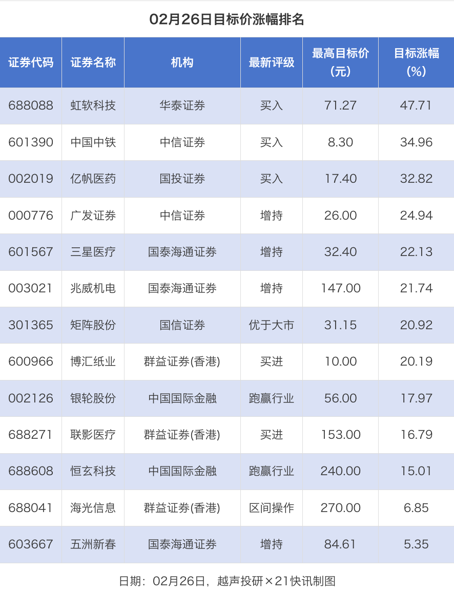 | 证券代码 | 证券名称 | 机构 | 最新评级 | 最高目标价 | 目标涨幅 | | --- | --- | --- | --- | --- | --- | | | | | | (元) | (%) | | 688088 | 虹软科技 | 华泰证券 | 买入 | 71.27 | 47.71 | | 601390 | 中国中铁 | 中信证券 | 买人 | 8.30 | 34.96 | | 002019 | 亿帆医药 | 国投证券 | 买入 | 17.40 | 32.82 | | 000776 | 广发证券 | 中信证券 | 增持 | 26.00 | 24.94 | | 601567 | 三星医疗 | 国泰海通证券 | 增持 | 32.40 | 22.13 | | 003021 | 兆威机电 | 国泰海通证券 | 增持 | 147.00 | 21.74 | | 301365 | 矩阵股份 | 国信证券 | 优于大市 | 31.15 | 20.92 | | 600966 | 博汇纸业 | 群益证券(香港) | 买进 | 1 0.00 | 20.19 | | 002126 | 银轮股份 | 中国国际金融 | 跑赢行 ...