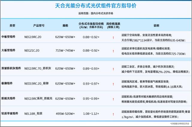 今年1月1日,Infolink公布的数据显示,在集中式、工商业分布式项目中,BC组件价格分别涨了2.6%、 3.9%。1月7日,组件价格再次上涨,双面双玻TOPCon组件均价达到了0.7元/W,比前一周上涨了 0.3%,比一个月前上涨了1%。 稳步上涨的光伏组件价格,传递出"春江水暖"的市场喜讯。 华夏能源网(公众号hxny3060)获悉,1月20日,天合光能(SH:688599)再次上调分布式光伏组件市 场指导价,这已是1月1日、1月13日调价后,开年以来的第三次调价了。 在上调3分/W后,天合光能最新的组件价格分别为:中版型、大版型组件价格为0.88-0.92+元/W,离1 元/W的价格已经不远了;功能型组件价格稍高,防眩光组件0.95-0.99+元/W,轻质单玻组件1.08- 1.12+元/W。 | | | | 天合光能分布式光伏组件官方指导价 | | | --- | --- | --- | --- | --- | | | | | 适用范围:国内分布式光伏市场 | | | 类型 | 产品型号 | 规格 | 分布式市场指导价格 周价格涨跌 (元/W:含脱不含四) (相较上路) | 说明 | | 中板型组件 ...
