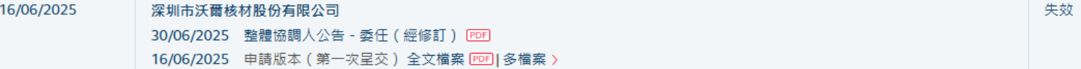 智通财经APP获悉,深圳市沃尔核材股份有限公司(简称:沃尔核材,002130.SZ)于6月16日所递交的港股招股书满6个月,于12月16日失效,递表时中信建投 国际、招商证券国际为其联席保荐人。 | | 30/06/2025 整體協調人公告 - 委任(經修訂) PDF | | --- | --- | | 16/06/2025 | 深圳市沃爾核材股份有限公司 16/06/2025 申請版本(第一次呈交) 全文檔案 四E 多檔案 > | 招股书显示,沃尔核材是高速数据通信与可替代能源电力传输综合解决方案提供商,亦是制造及销售高速数据通信重要元器件高速铜缆市场的领军企业。有 关产品实现算力中心中功能模块之间的高速连接,加快群集内数据传输效率的同时确保最佳能源消耗和坚实的可靠性。有效促进了高质量基础设施的快速部 署,推动大模型在不同行业中的广泛应用。 ...
