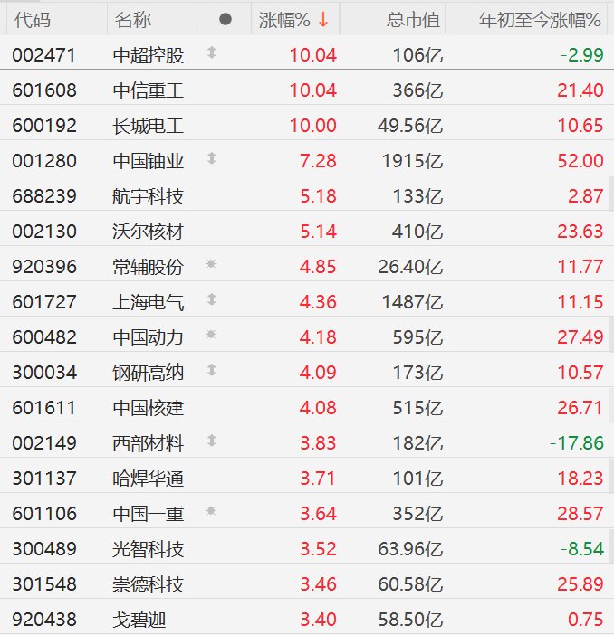 格隆汇1月22日|A股市场核能核电股走强,其中,中超控股、中信重工、长城电工涨停,中国铀业涨 超7%,航宇科技、沃尔核材涨超5%,常辅股份、上海电气、中国动力、钢研高纳、中国核建涨超4%。 消息面上,美国总统特朗普称,美国正"大力"发展核能。已签署行政命令,批准新建多家核工厂。 | 代码 | 名称 | | 涨幅% ↓ | 总市值 | 年初至今涨幅% | | --- | --- | --- | --- | --- | --- | | 002471 | 中超控股 | 1 | 10.04 | 106亿 | -2.99 | | 601608 | 中信重工 | | 10.04 | 366亿 | 21.40 | | 600192 | 长城电工 | | 10.00 | 49.56 乙 | 10.65 | | 001280 | 中国轴业 | 1 | 7.28 | 1915亿 | 52.00 | | 688239 | 航宇科技 | | 5.18 | 133亿 | 2.87 | | 002130 | 沃尔核材 | | 5.14 | 410亿 | 23.63 | | 920396 | 常辅服份 | 美 | 4.85 | 26.40 ...