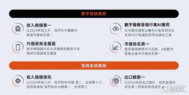 如果说上一轮港股的时代红利由互联网巨头们共同书写,那么下一轮价值发现的核心叙事,则必然绕不 开AI这场深刻的产业变革。当AI技术从模型走向应用,从虚拟渗透至实体,"AI+制造"的融合赛道正迅 速成为资本市场的关键战场,其蕴含的价值重估潜力已初现端倪。 在这一历史性的交汇点上,港交所即将迎来一位独特AI选手——来自深交所主板的利欧股份 (002131.SZ)。该公司已于9月29日正式向港交所递交招股书,启动"A+H"上市征程。若成功上市,利欧 股份有望成为港股市场中稀缺的"AI数字营销+AI智造"第一股,借此开启国际化资本布局的新篇章。 那么这家公司的价值潜力究竟几何? 01 "AI数字营销+智能泵与系统"布局稀缺标的,双轮驱动构筑价值护城河 利欧股份并非一家纯粹的AI概念公司,而是一家将AI技术深度融入两大看似迥异、实则内在协同的业 务——数字营销+智能泵与系统的实干型企业。 (来源:公司招股书) 在AI数字营销领域,利欧股份是国内头部AI驱动型数字营销集团,2024年实现中国数字营销市场收入 规模第一。在数字广告代理领域,以2024年数据计,公司所占市场份额达8.72%。 利欧股份以"品—效—销"一体化全链 ...