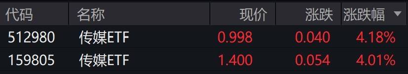 Group 1 - Media concept stocks showed strong performance in the afternoon, with Kunlun Wanwei rising over 8%, Leo Group up over 6%, Shenzhou Taiyue increasing over 5%, and Giant Network gaining over 4% [1] - The Media ETF rose over 4% as a result of market trends [1] Group 2 - Some brokerages indicate that in the medium to long term, the media industry's prosperity is expected to recover due to gradual restoration of content supply, deepening AI technology empowerment, policy support, and expectations of consumer recovery [2] - Companies in the film and television, gaming, and advertising sectors that show strong performance are recommended for attention, along with those involved in digital assets and AIGC-related technologies [2]