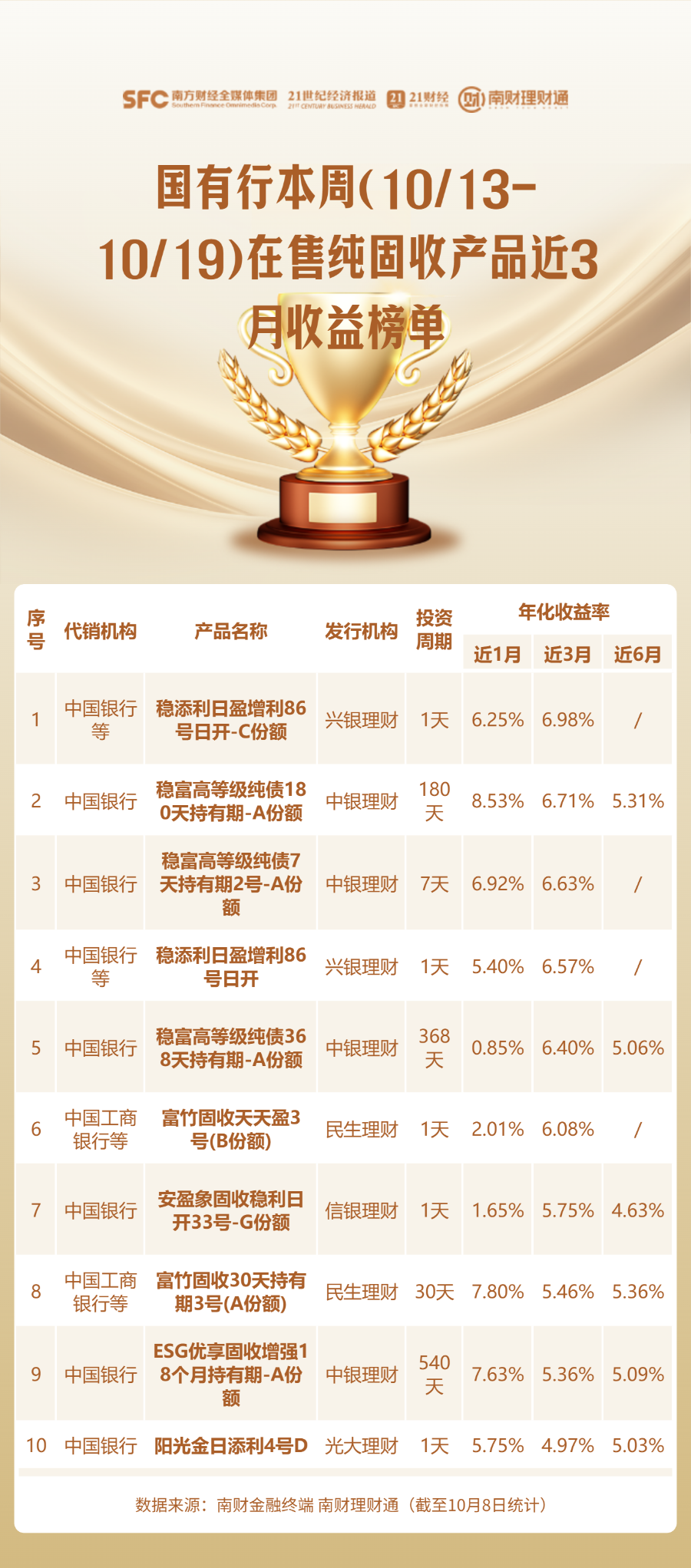 银行渠道本周在售纯固收理财产品榜单(10/13-10/19)