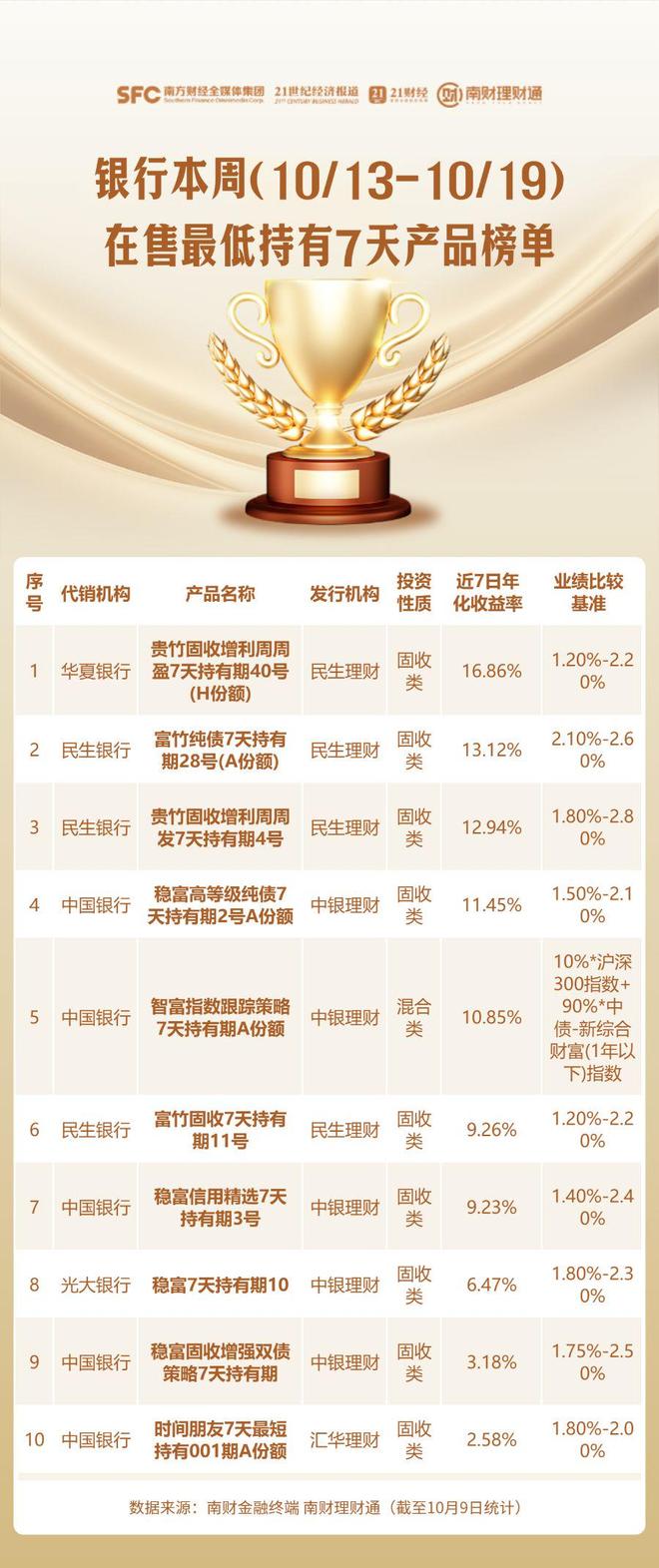 银行渠道本周在售最低持有期产品榜单(10/13-10/19)