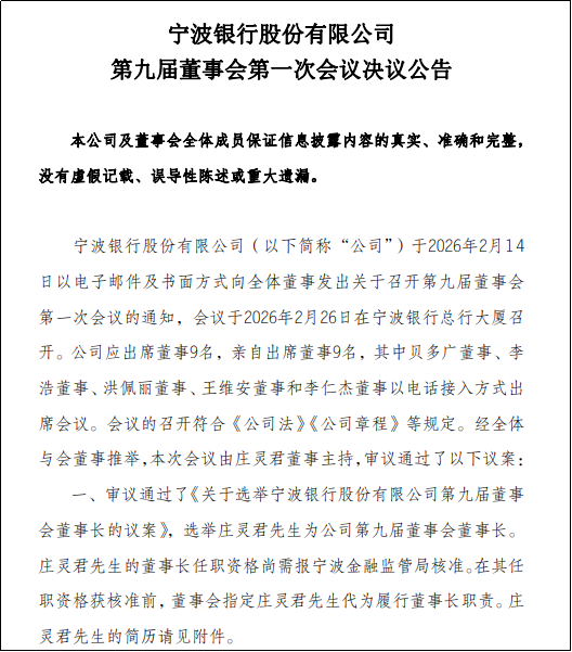 2月26日,宁波银行发布公告称,该行审议通过了《关于选举宁波银行股份有限公司第九届董事会董事长的议案》, 选举庄灵君为公司第九届董事会董事长。庄灵君的董事长任职资格尚需报宁波金融监管局核准。在其任职资格获核准 前,董事会指定庄灵君代为履行董事长职责。 冯培炯:1974年11月出生,硕士研究生学历,高级经济师。现任公司党委副书记、执行董事。冯培炯历任公司东门支 行办公室副主任,总行人力资源部主管、总助级高级副主管、总经理助理、副总经理、总经理,总行个人银行部、信 用卡中心总经理,苏州分行行长;2015年4月至2026年2月任公司副行长;2016年2月至今任公司执行董事。 同时,宁波银行审议通过了《关于选举宁波银行股份有限公司第九届董事会副董事长的议案》《关于聘任宁波银行股 份有限公司行长的议案》,选举冯培炯为公司第九届董事会副董事长,同意聘任冯培炯为公司行长。冯培炯的副董事 长、行长任职资格尚需报宁波金融监管局核准。在其任职资格获核准前,董事会指定冯培炯代为履行行长职责。 庄灵君:1979年7月出生,硕士研究生学历,正高级经济师。现任公司党委书记、执行董事。庄灵君历任公司北仑支 行行长助理,总行个人银行部总经理 ...