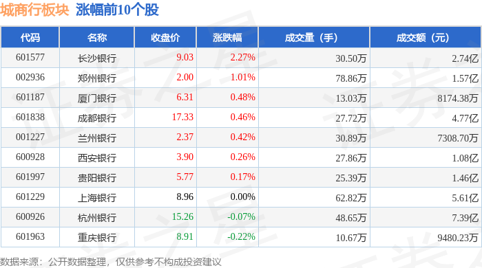证券之星消息,10月9日城商行板块较上一交易日下跌0.34%,苏州银行领跌。当日上证指数报收于 3933.97,上涨1.32%。深证成指报收于13725.56,上涨1.47%。城商行板块个股涨跌见下表: | 代码 | 名称 | 收盘价 | 涨跌幅 | 成交量(手) | 成交额(元) | | | --- | --- | --- | --- | --- | --- | --- | | 601577 | 长沙银行 | 9.03 | 2.27% | 30.50万 | | 2.74亿 | | 002936 | 郑州银行 | 2.00 | 1.01% | 78.86万 | | 1.57亿 | | 601187 | 厦门银行 | 6.31 | 0.48% | 13.03万 | | 8174.38万 | | 601838 | 成都银行 | 17.33 | 0.46% | 27.72万 | | 4.77亿 | | 001227 | 兰州银行 | 2.37 | 0.42% | 30.89万 | | 7308.70万 | | 600928 | 西安银行 | 3.90 | 0.26% | 27.86万 | | 1.08亿 | | 6 ...