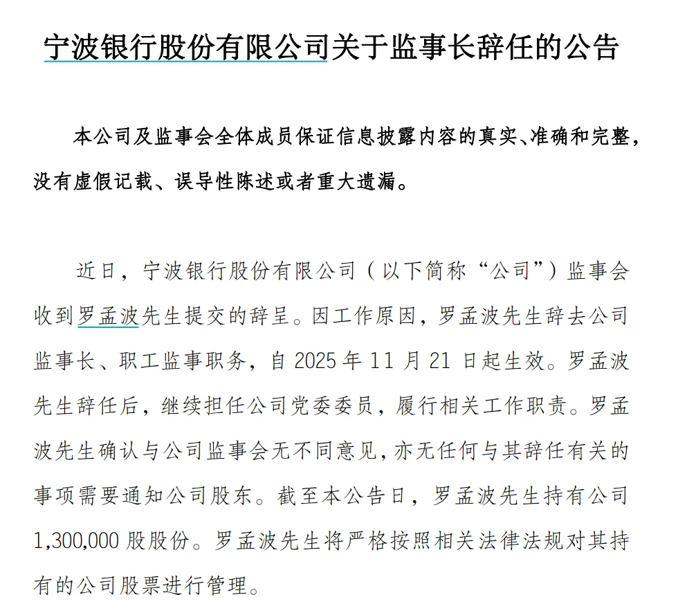11月21日,宁波银行(002142)发布公告称,近日该行监事会收到罗孟波提交的辞呈。因工作原因,罗孟波辞去公司监事长、职工监事职 务,自2025年11月21日起生效。罗孟波辞任后,继续担任公司党委委员,履行相关工作职责。 ...