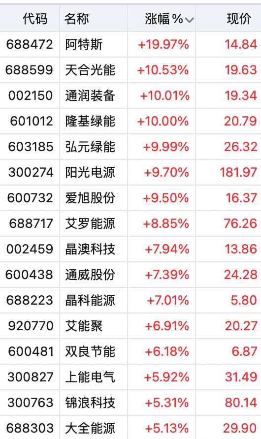 光伏设备板块强势拉升,阿特斯20cm涨停