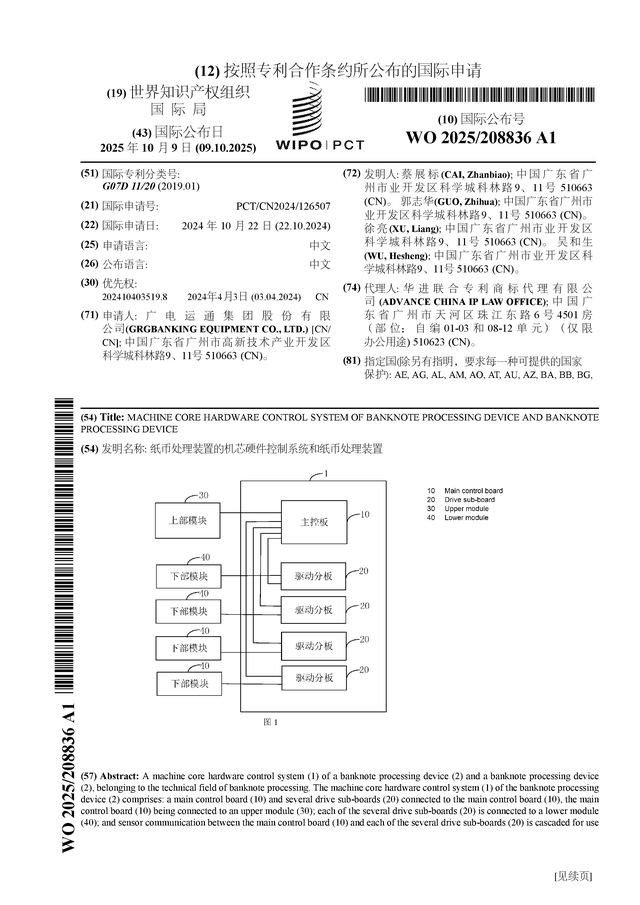广电运通公布国际专利申请:“纸币处理装置的机芯硬件控制系统和纸币处理装置”