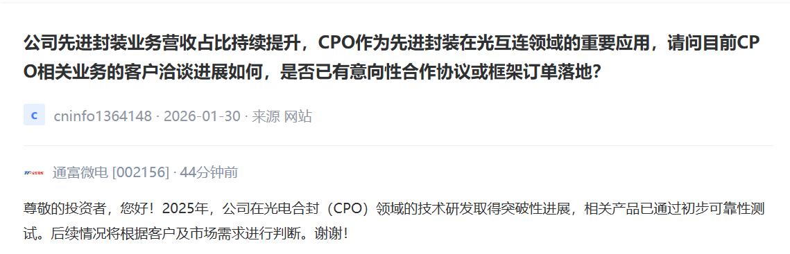 通富微电:公司去年在光电合封(CPO)领域的技术研发取得突破性进展,相关产品已通过初步可靠性测试